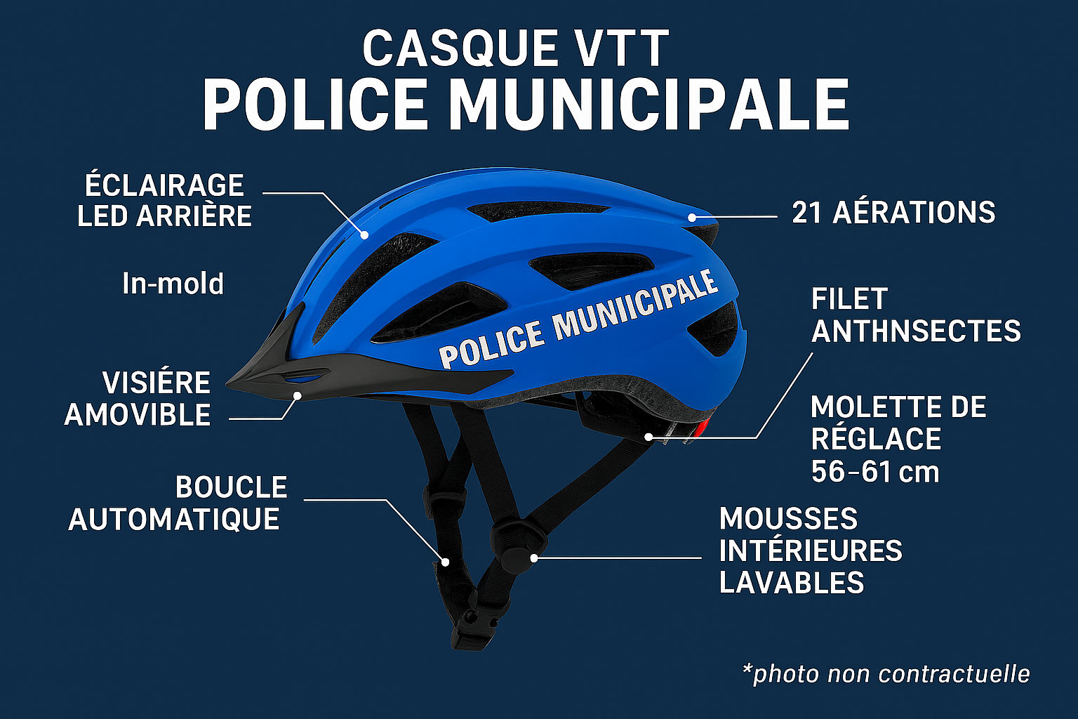 La boucle de fermeture automatique et la molette de réglage arrière permettent un ajustement précis pour les tailles de 56 à 61 cm. Sa couleur bleue distinctive, sérigraphiée POLICE MUNICIPALE, garantit une reconnaissance immédiate sur le terrain.