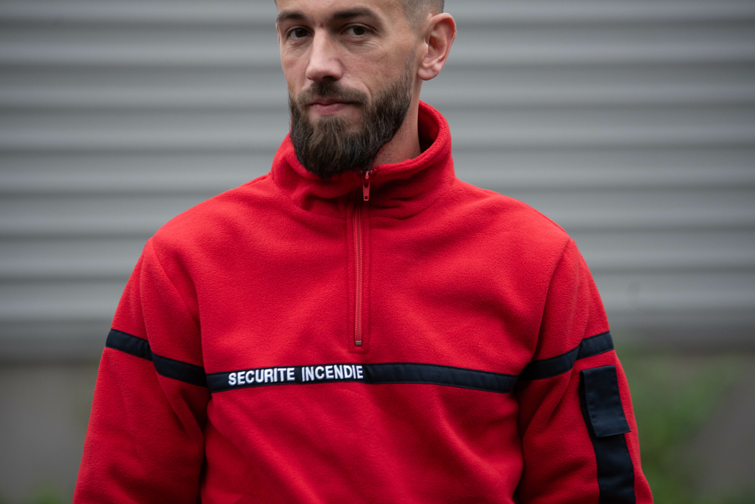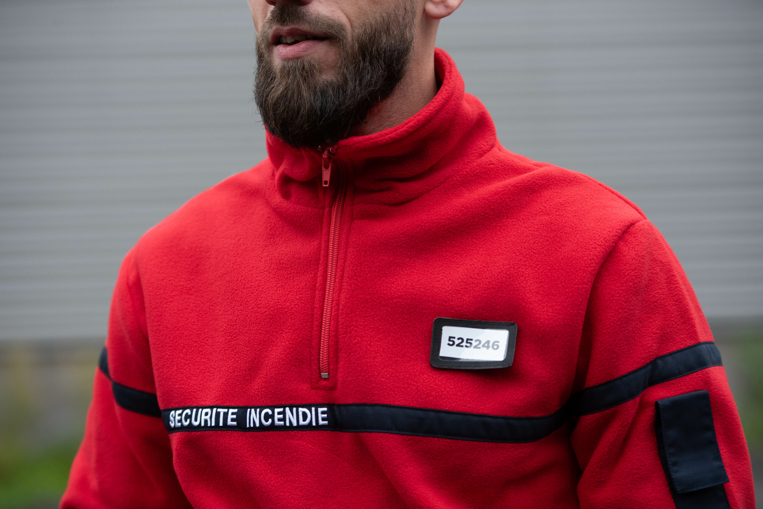 - Broderie “SÉCURITÉ INCENDIE” en blanc (15,5 × 1,3 cm), placée sur la bande poitrine, côté opposé au cœur